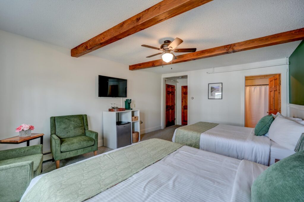 This double-queen room offers sweeping views of the lake and mountains with plenty of floor space to support more than one guest.